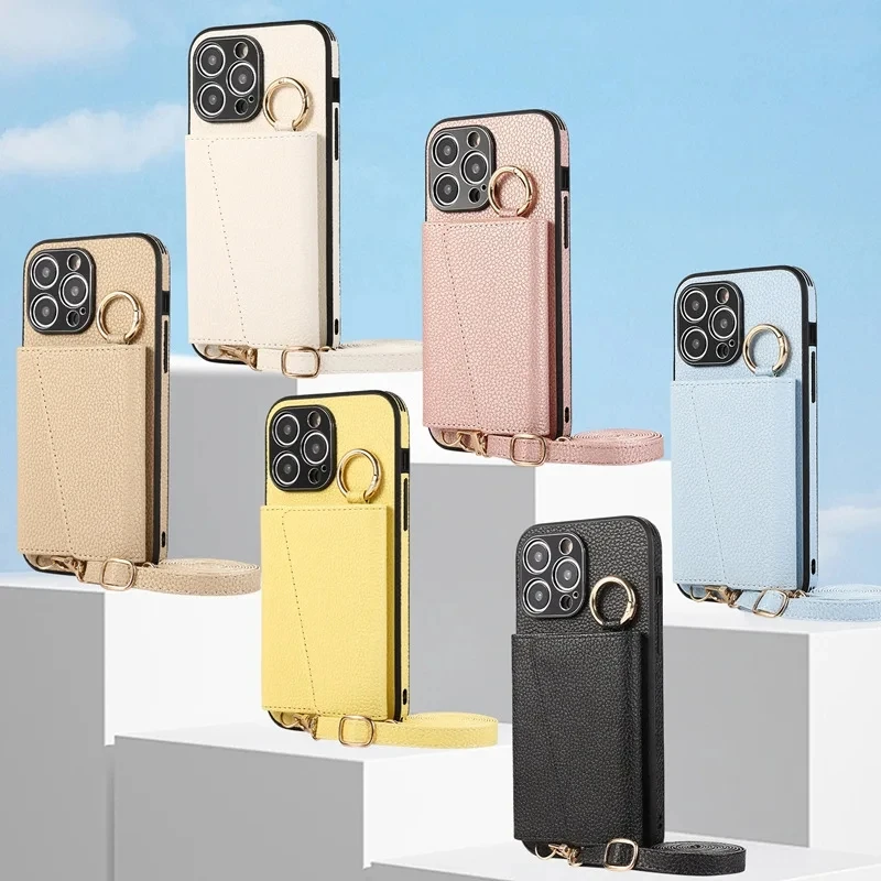 Crossbody Wallet Makeup Mirror Phone Case For iPhone 16 15 Pro Max 14 16Pro 13 12 Ring Holder Card Pocket Leather Lanyard Cover